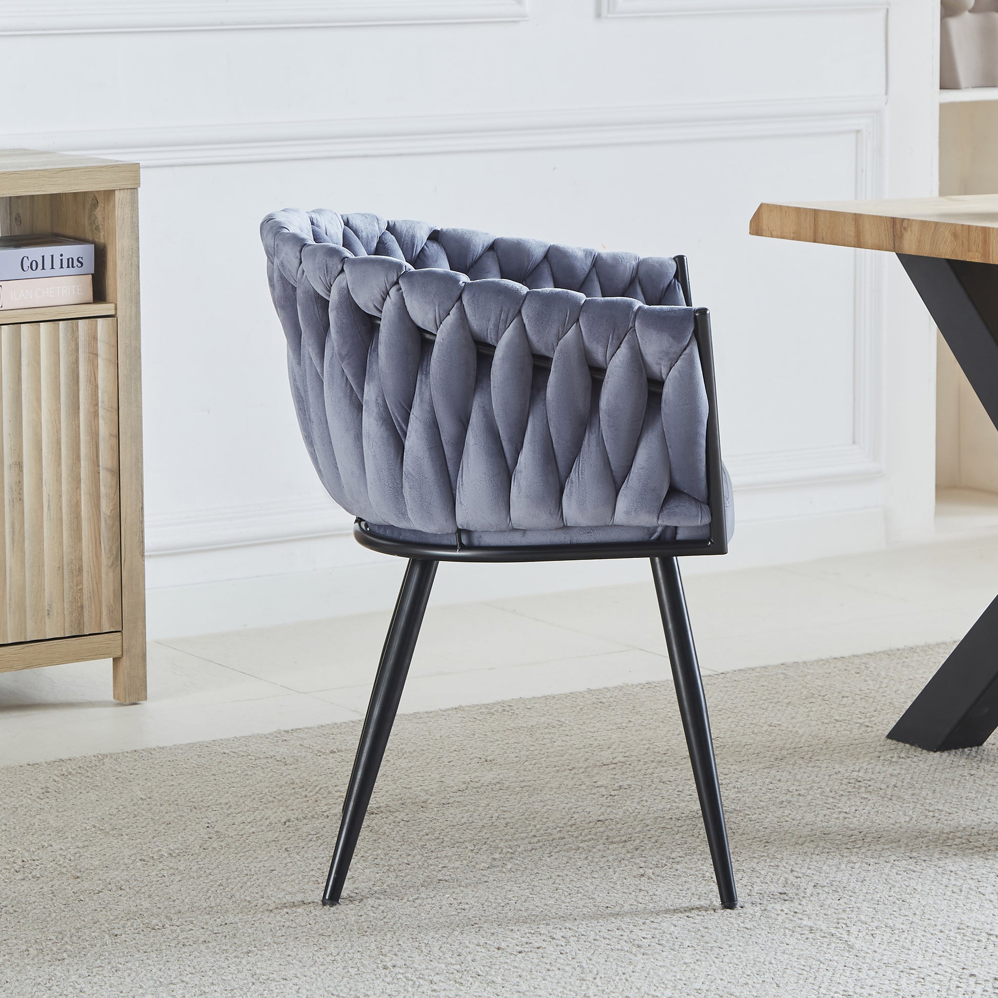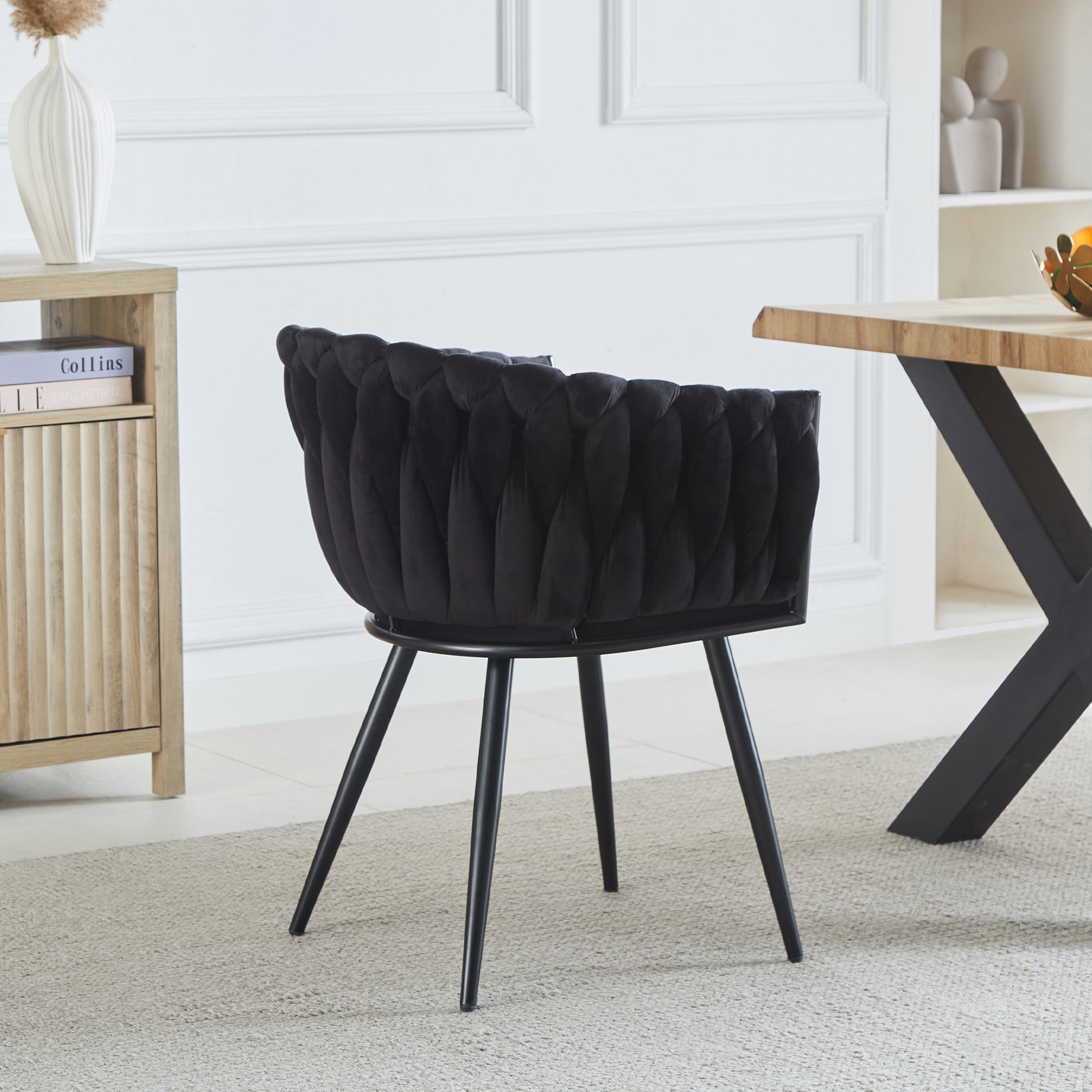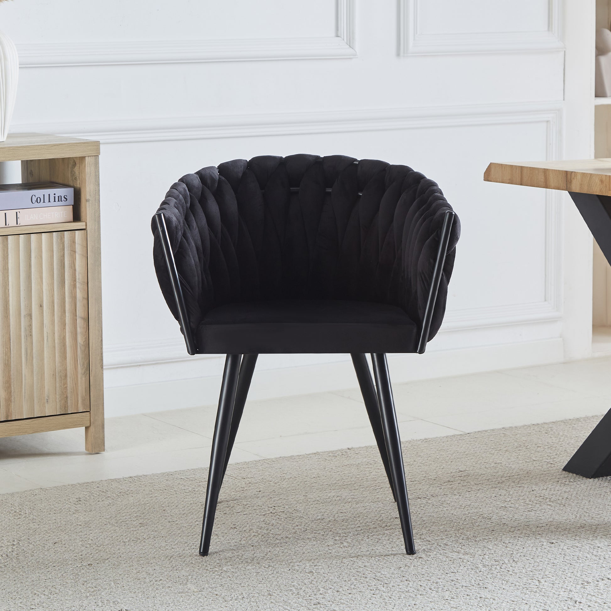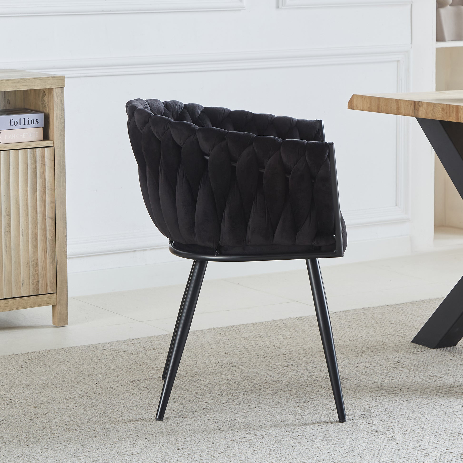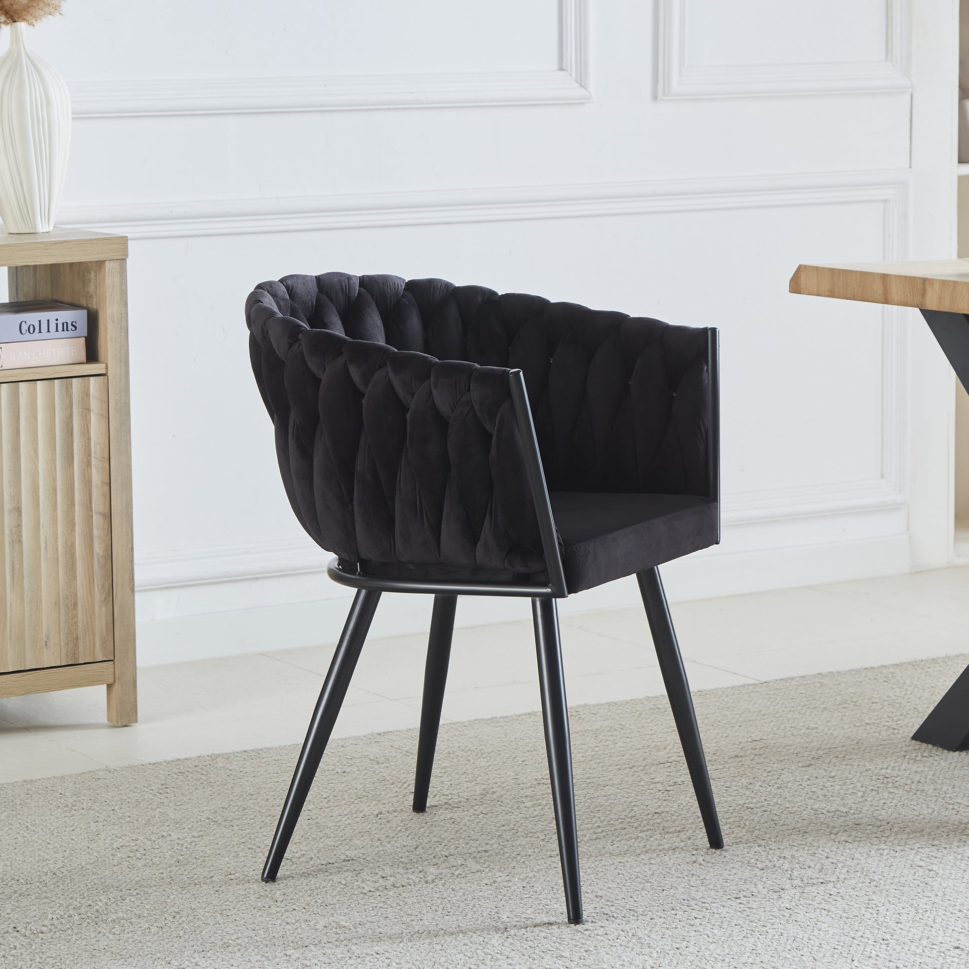 Introducing the Baiano Dining Chairs, available as a set of 2, designed to elevate your dining experience with a touch of luxury. Upholstered in plush velvet, these chairs offer an opulent feel that enhances any dining space. The foam interior ensures lasting comfort, perfect for extended meals and gatherings. Supported by long black powder-coated metal legs, the Baiano Dining Chairs combine durability with a sleek, modern aesthetic. Featuring a contemporary weave finish, they add a unique and stylish texture to your decor, seamlessly blending elegance with contemporary design.