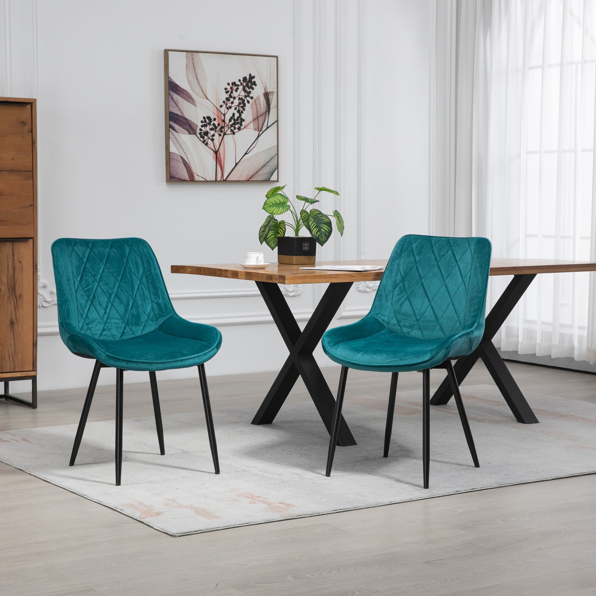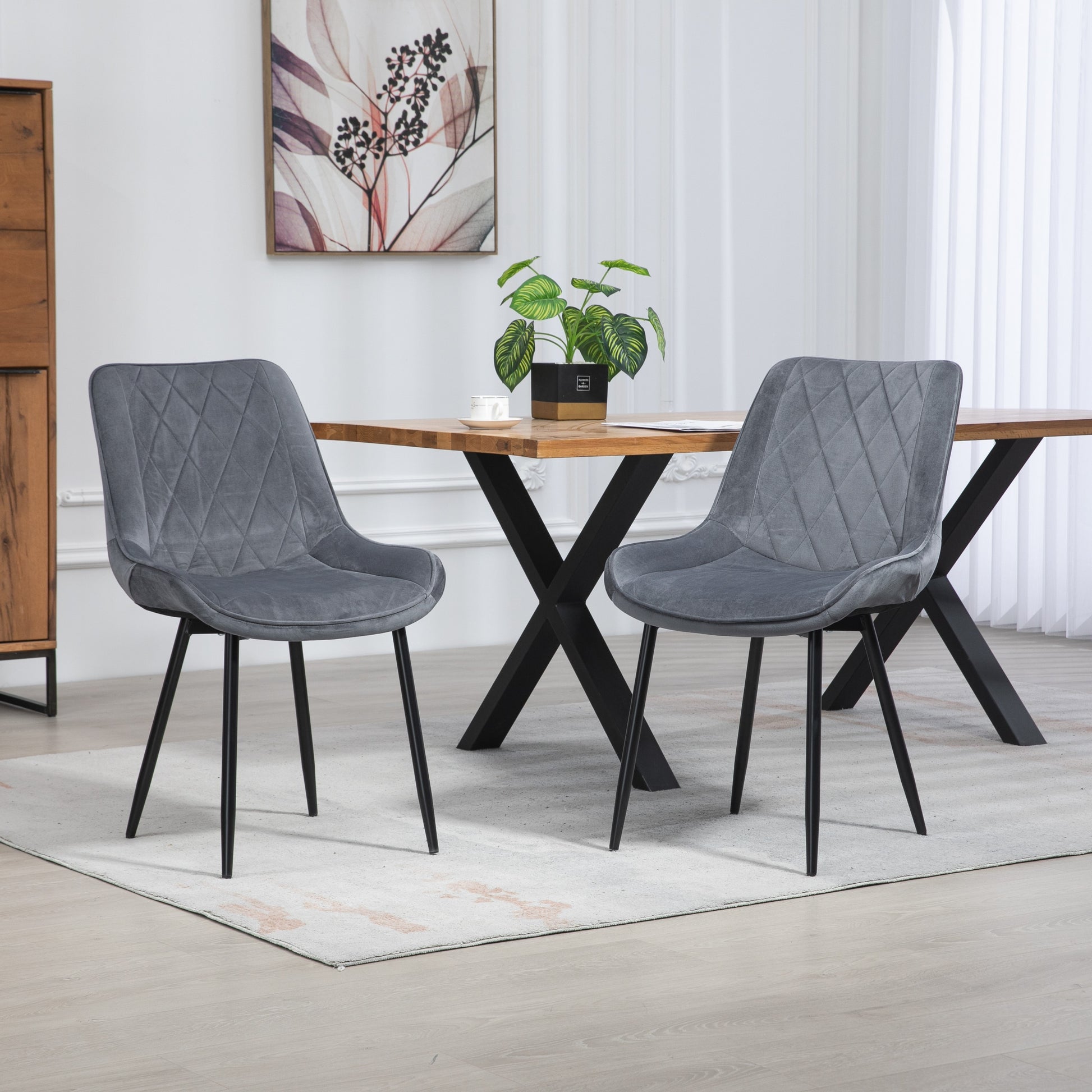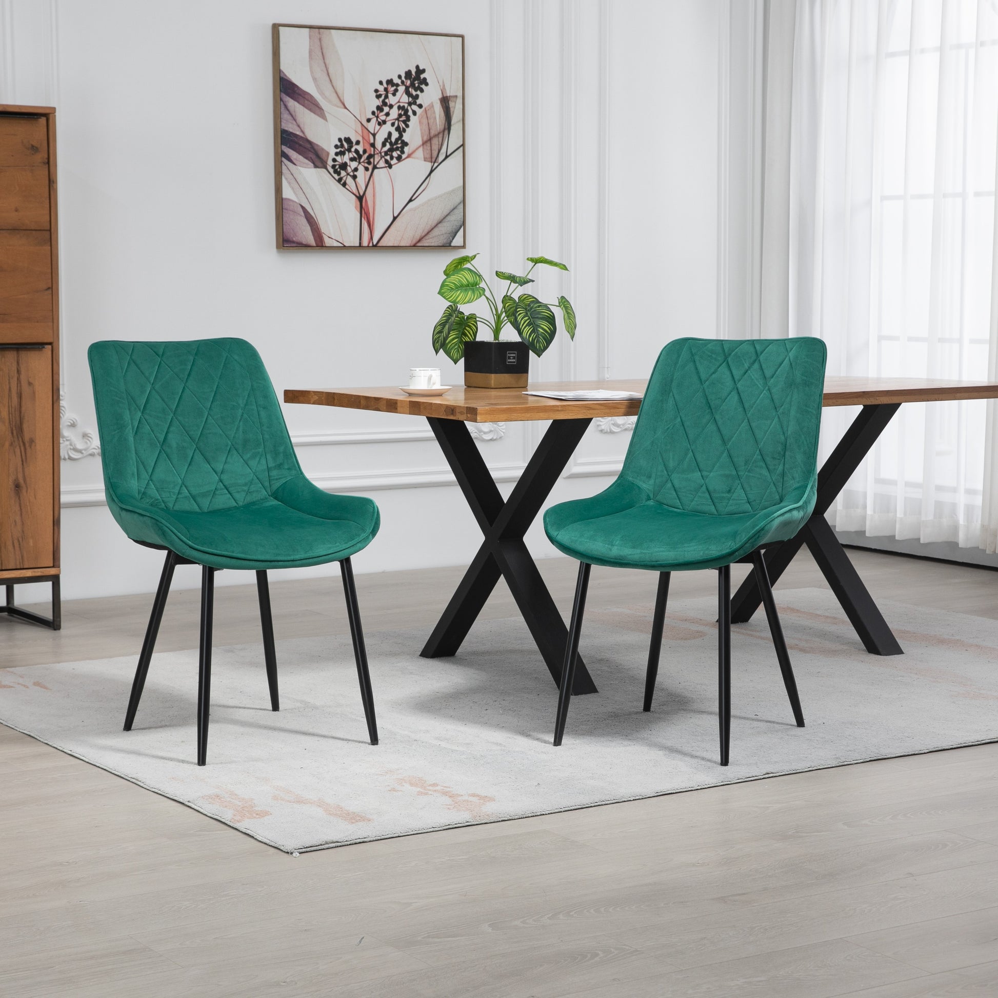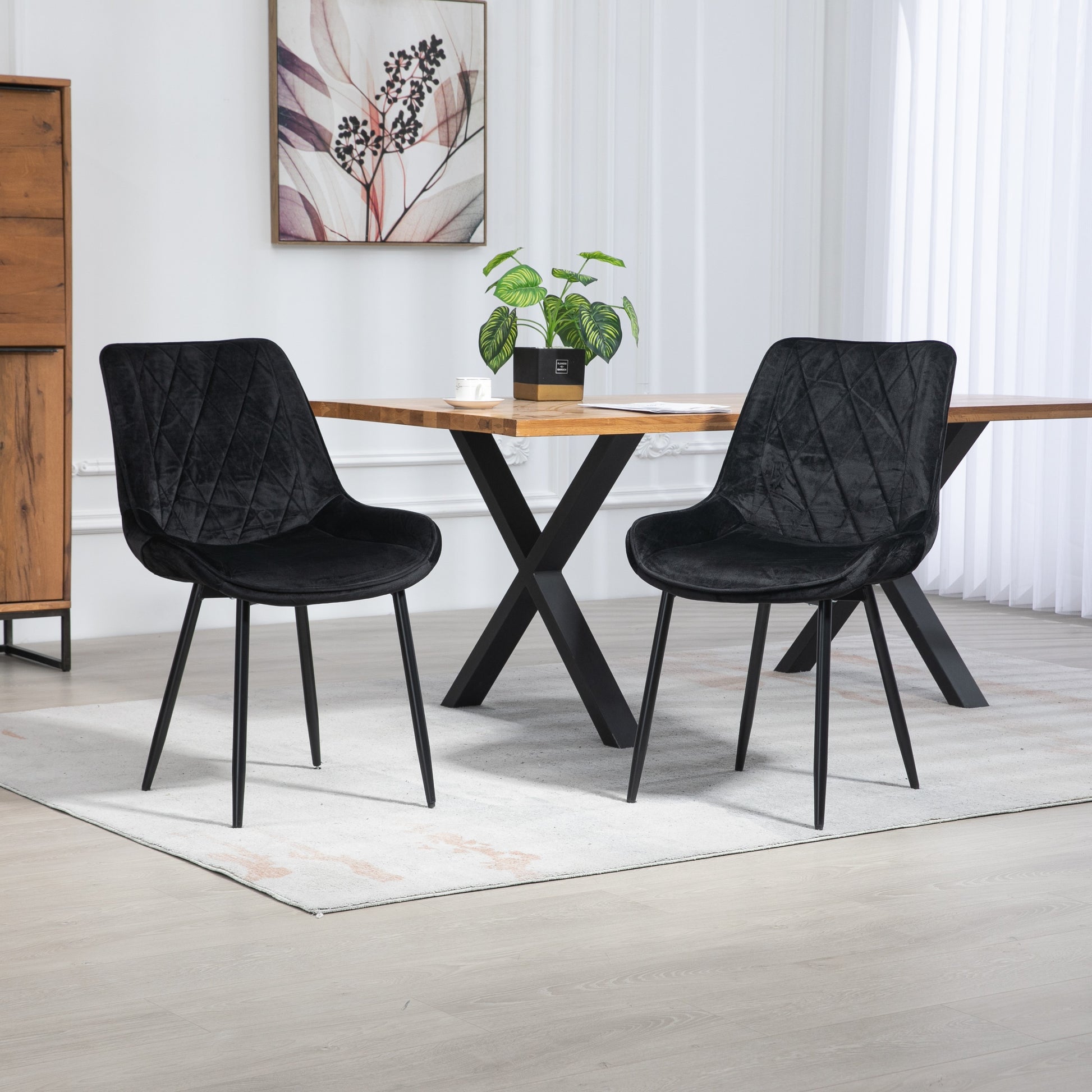 Wrapped in sumptuous velvet fabric upholstery, the chairs offer a luxurious feel that invites you to linger at the table. The wide, spacious seat ensures optimal comfort during long dinners and lively conversations, creating an inviting atmosphere for family and friends. The diamond patterned back not only adds a modern flair but also provides excellent lumbar support, making these chairs a perfect choice for both style and ergonomics.