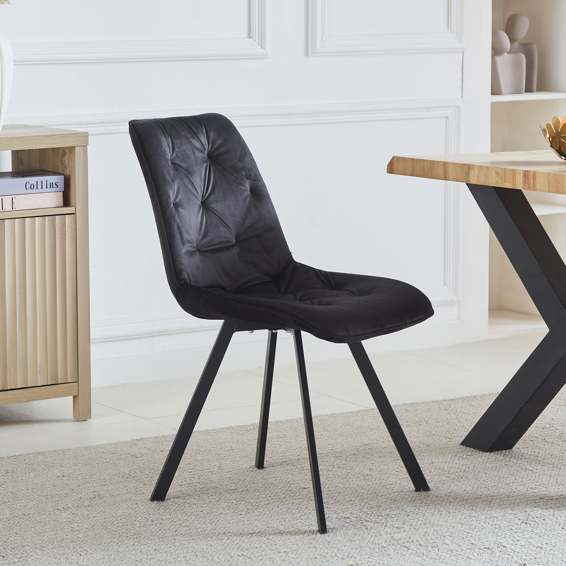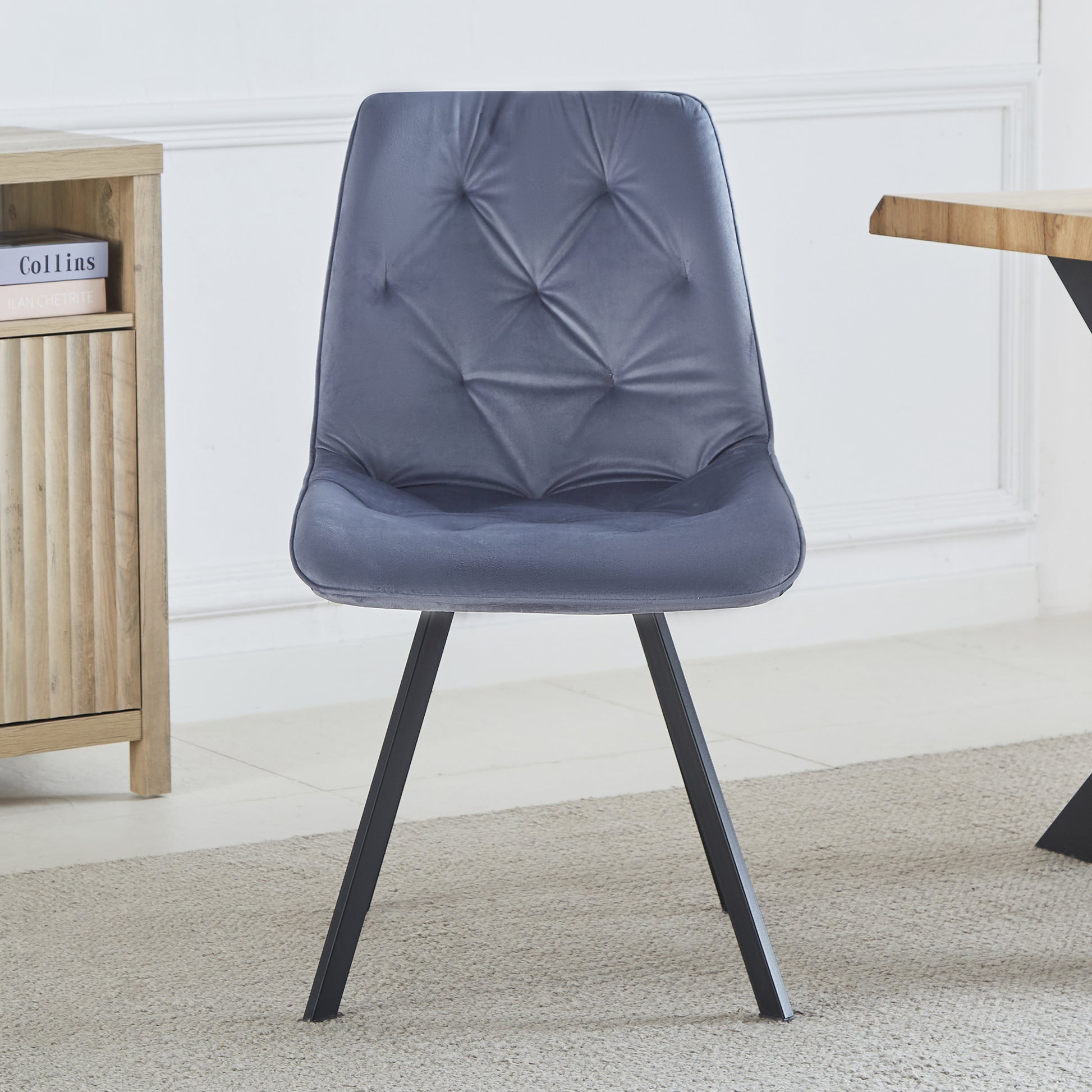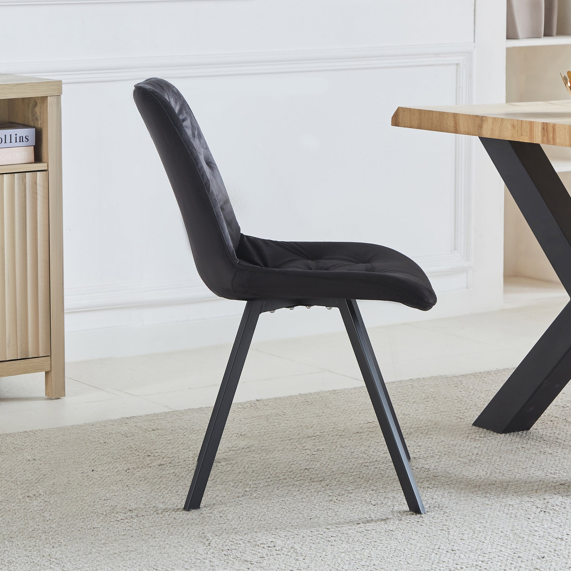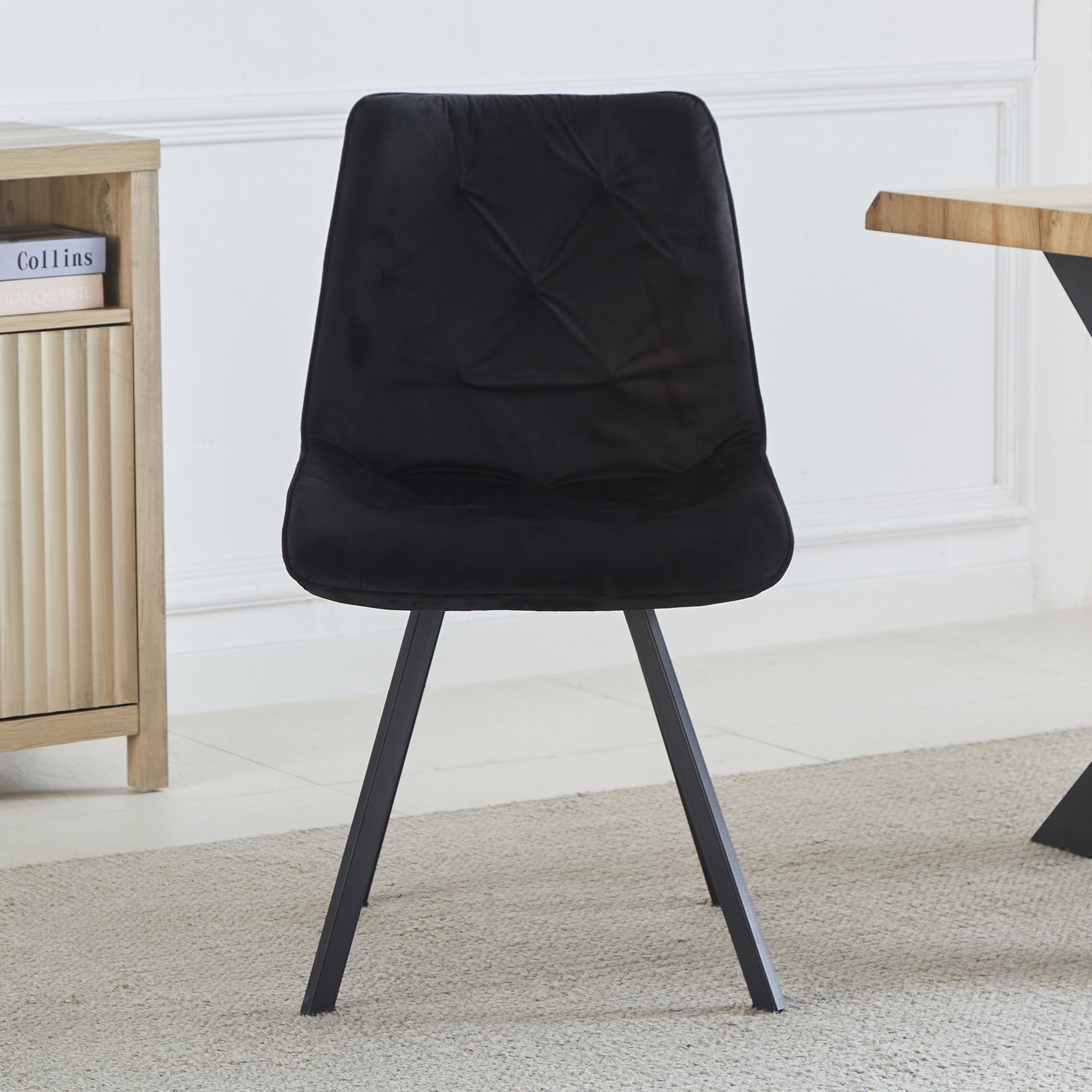 Enhance your dining space with the luxurious Caprile Dining Chairs, available as a set of 2. These elegant chairs are upholstered in plush velvet, offering a sumptuous feel that adds sophistication to any dining room. Featuring long black powder-coated metal legs, they combine modern style with durability. The foam interior ensures comfort, while the studded diamond back design provides a touch of glamour, making these dining chairs a perfect blend of comfort and style. Ideal for both contemporary and traditional settings, the Caprile Dining Chairs are a stylish and practical addition to your home.