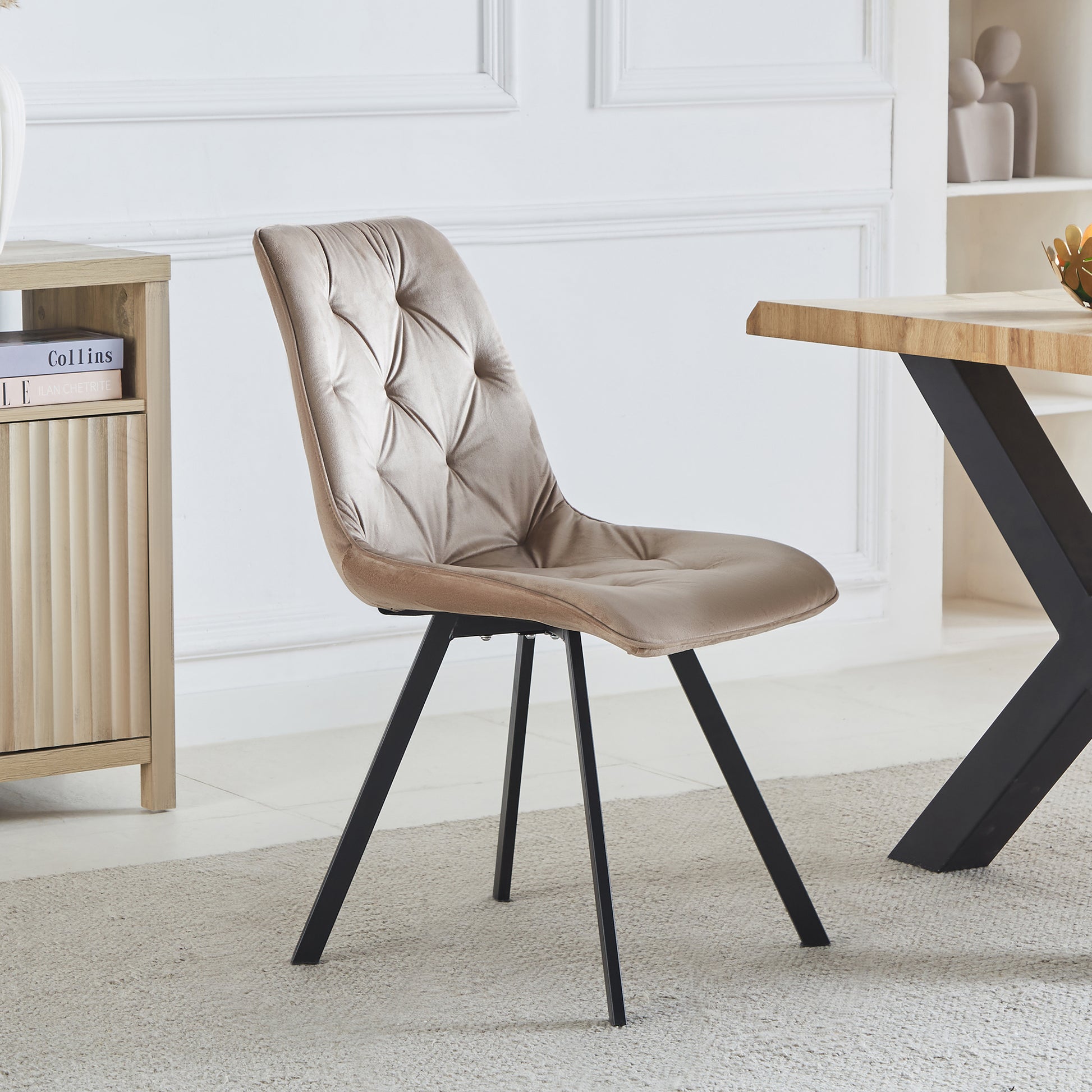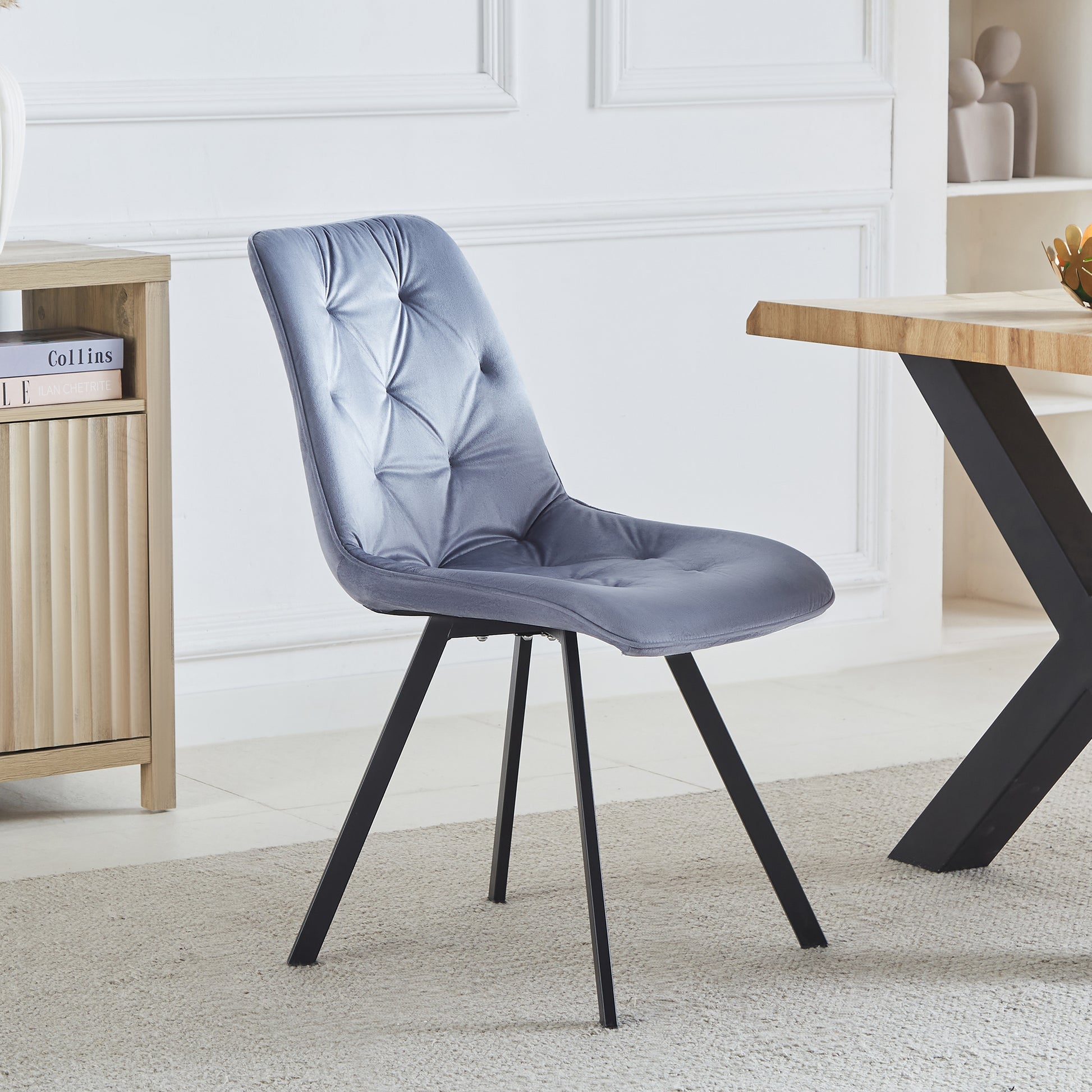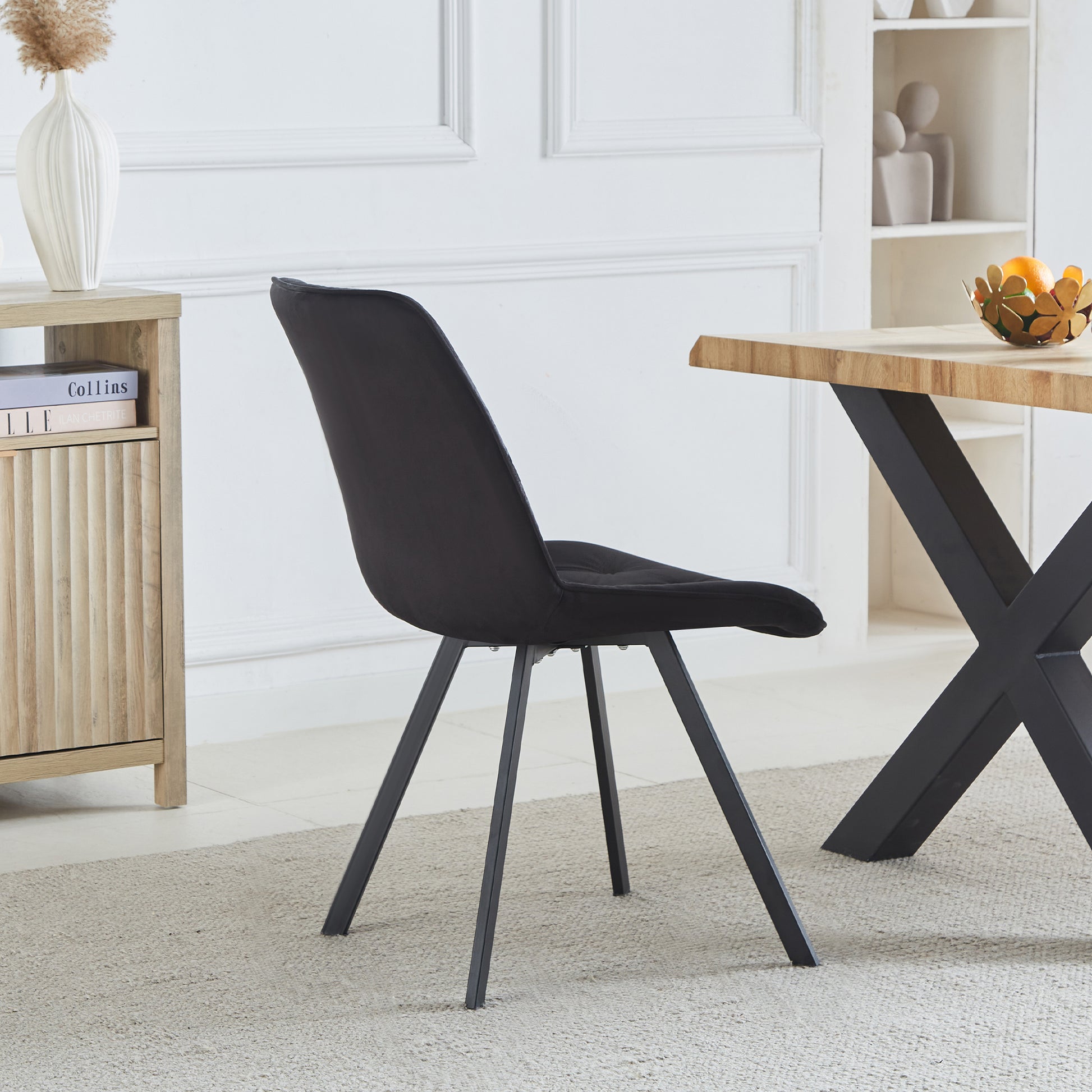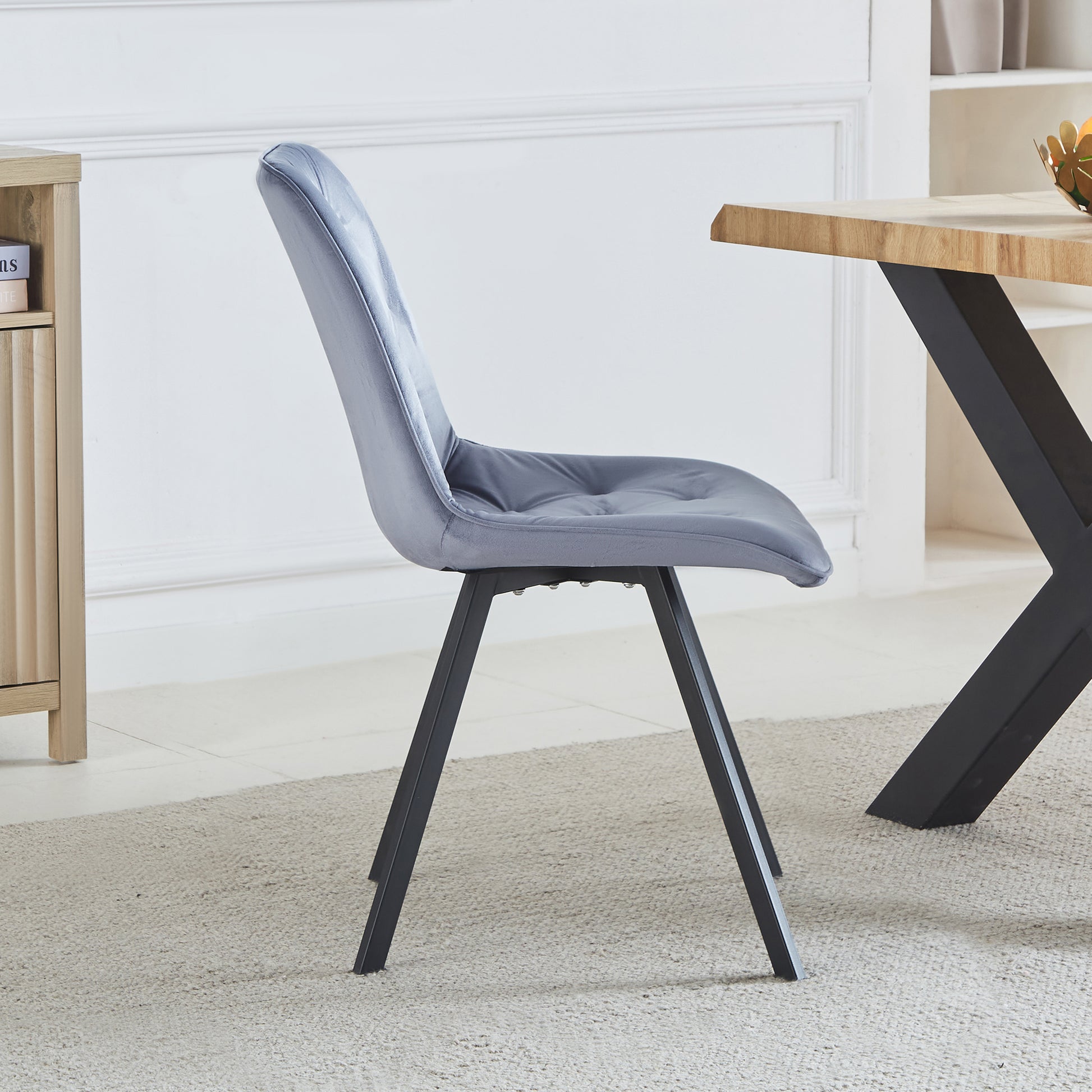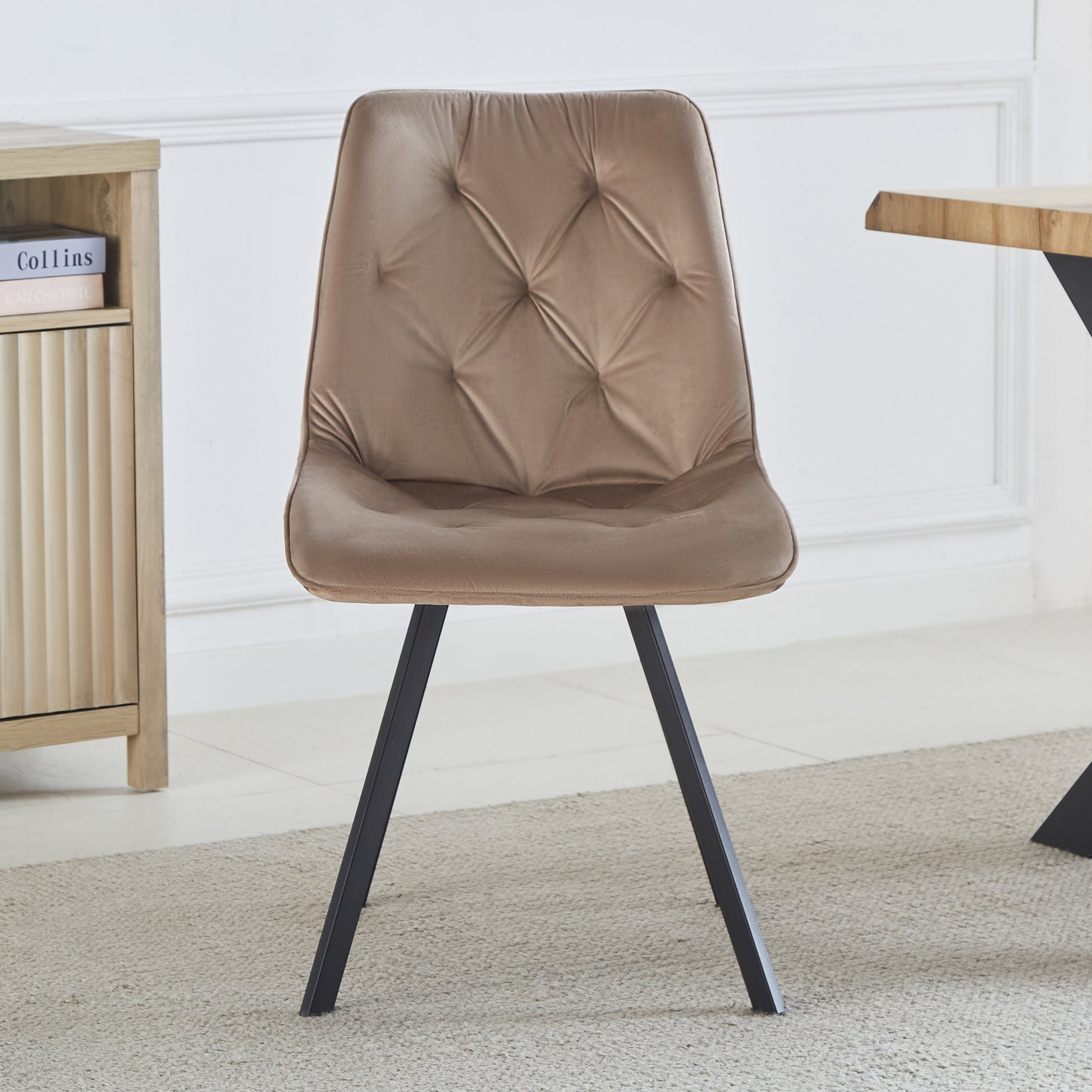 Enhance your dining space with the luxurious Caprile Dining Chairs, available as a set of 2. These elegant chairs are upholstered in plush velvet, offering a sumptuous feel that adds sophistication to any dining room. Featuring long black powder-coated metal legs, they combine modern style with durability. The foam interior ensures comfort, while the studded diamond back design provides a touch of glamour, making these dining chairs a perfect blend of comfort and style. Ideal for both contemporary and traditional settings, the Caprile Dining Chairs are a stylish and practical addition to your home.